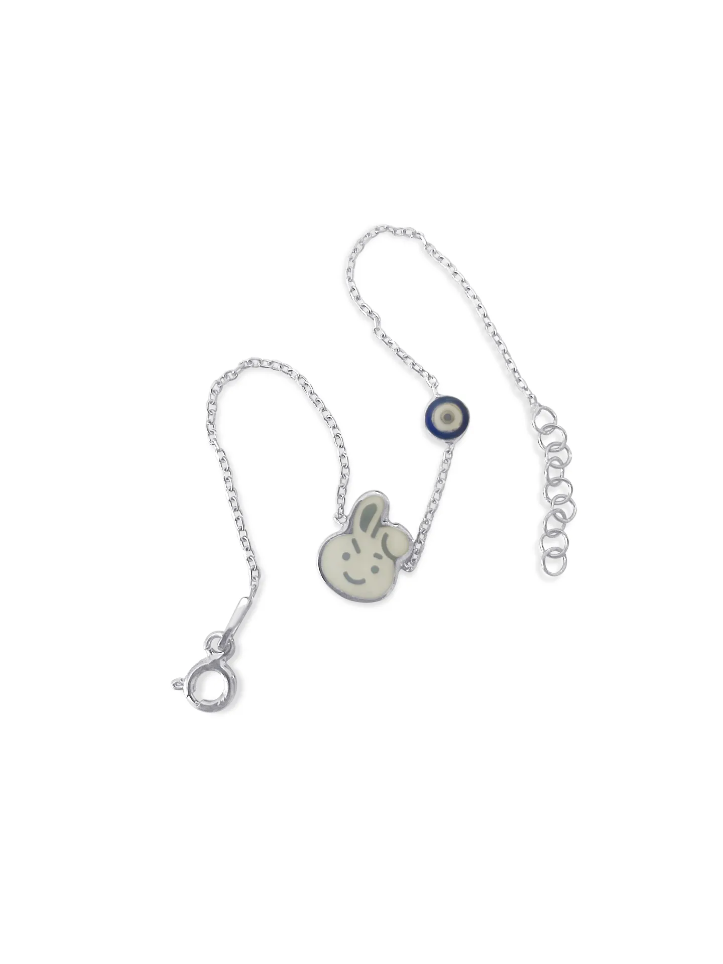 Ασημένιο, παιδικό βραχιόλι για κορίτσια & αγόρια, με σμάλτο, μάτι βασκανίας & λαγουδάκι, 14,5 εκατοστά μήκος με αλυσίδα επέκτασης 2,4 εκατοστών, woofie, WBRA 17,