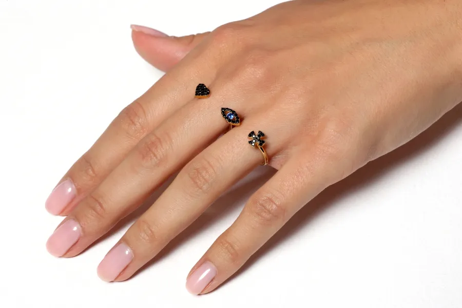 925 ασημένιο γυναικείο δαχτυλίδι, για δυο δάχτυλα, επιχρυσωμένο, με μαυρα ζιργκόν.
