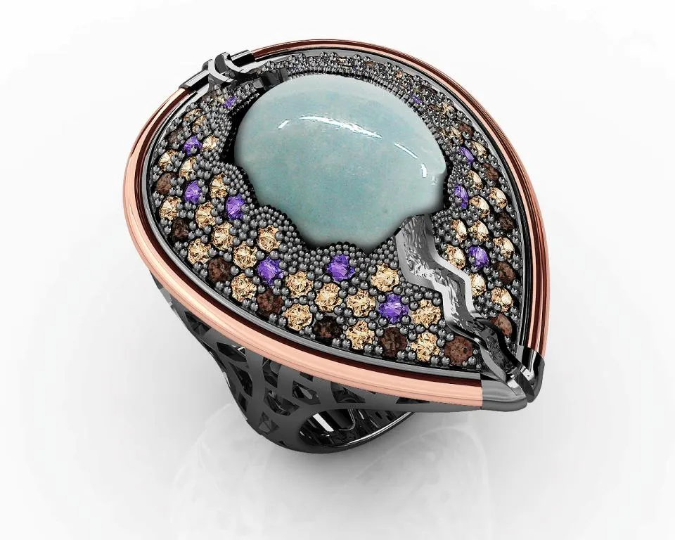 Δαχτυλίδι, γυναικείο, ασημένιο, με φλούδα χρυσού Κ18, άκουα μαρίνα και ζιργκόν, με ασπρόμαυρο επιπλατίνωμα, silverline,0430646901