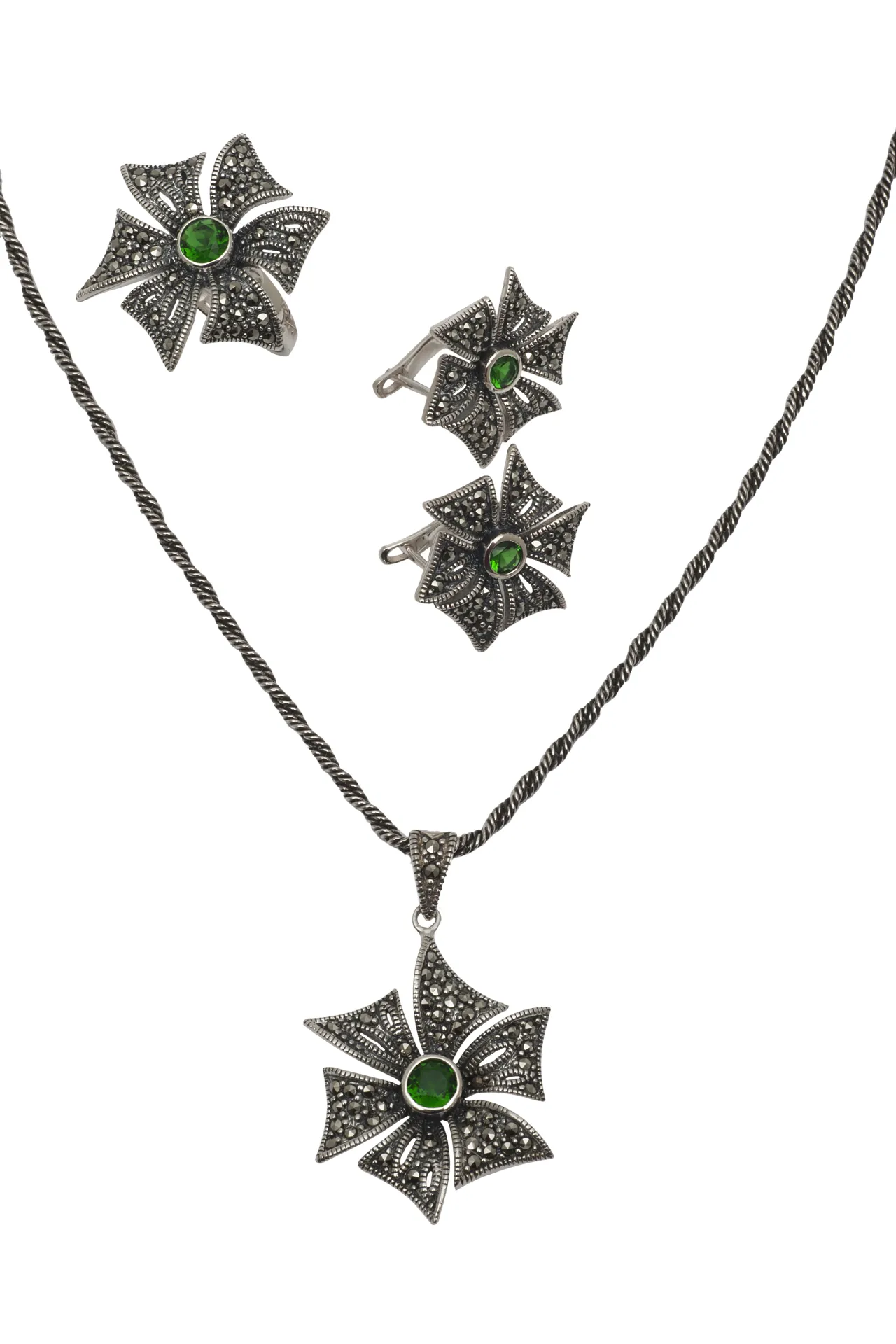 silverline,ασημένιο, γυναικείο, δαχτυλίδι, οξειδωμένο με μαρκασίτη, πράσινα, ζιργκόν(η τιμή αφορά μόνο το δαχτυλίδι όχι ολόκληρο το σετ)