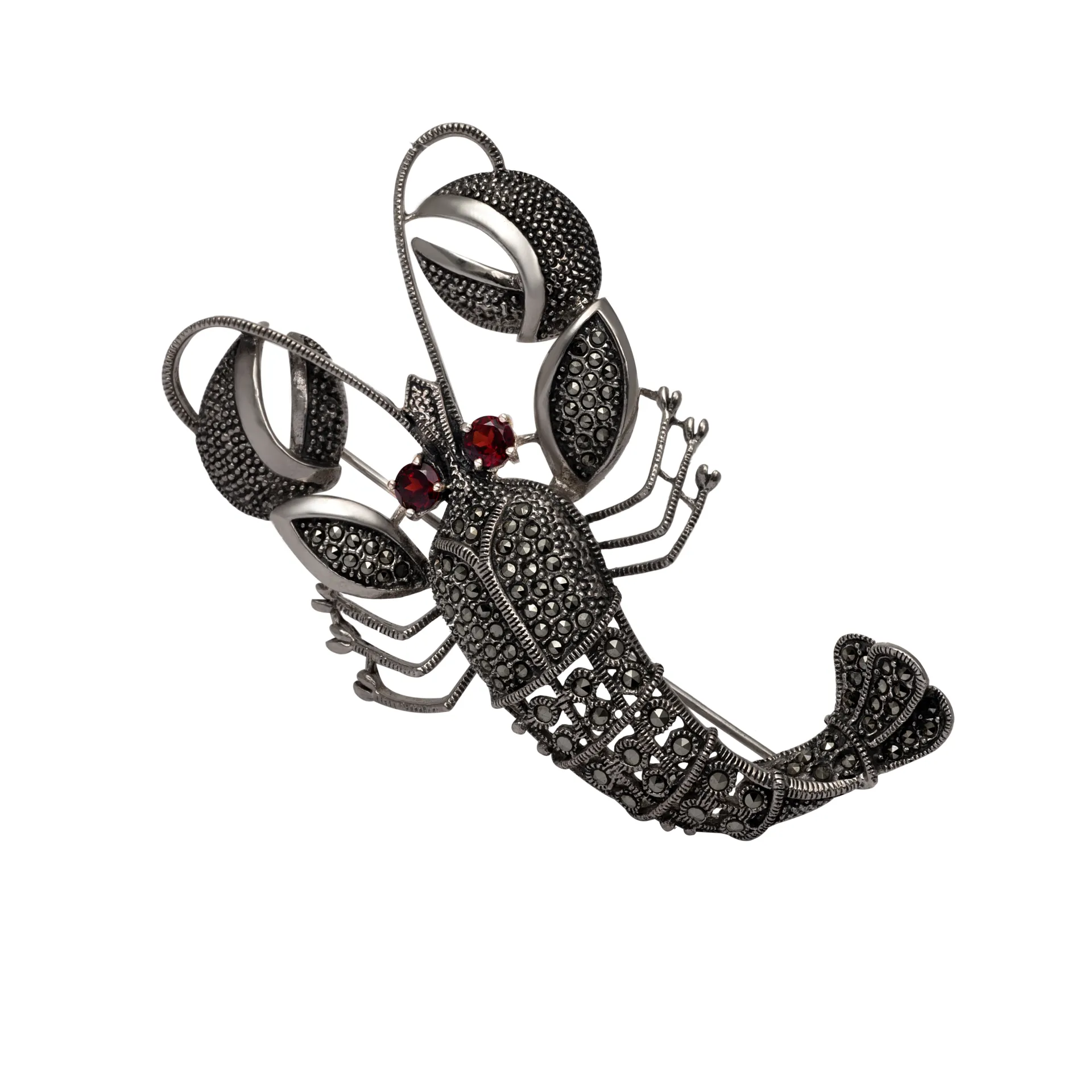 Καρφίτσα, ασημένια, γυναικεία, αστακός, με μαρκασίτες & ζιργκόν στο χρώμα γρανάδας, 7,2X4,5 εκατοστά, silverline,0730089401