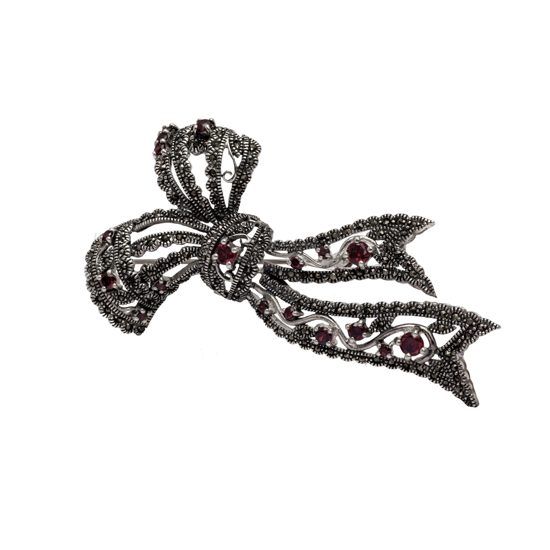 Kαρφίτσα, ασημένια, γυναικεία, οξειδωμένη, φιόγκος, με ορυκτές πέτρες , μαρκασίτες & κόκκινα ζιργκόν, 7,5Χ4 εκατοστά, silverline, 0730132201