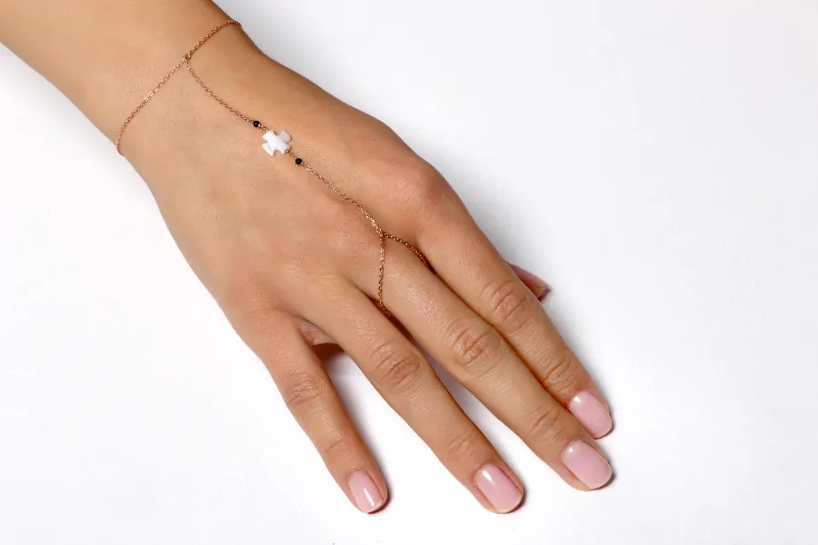 925 ασημένιο γυναικείο βραχιόλι με δαχτυλίδι,ροζ χρυσό,με σταυρό λευκό φίλντισι και μαύρο όνυχα.