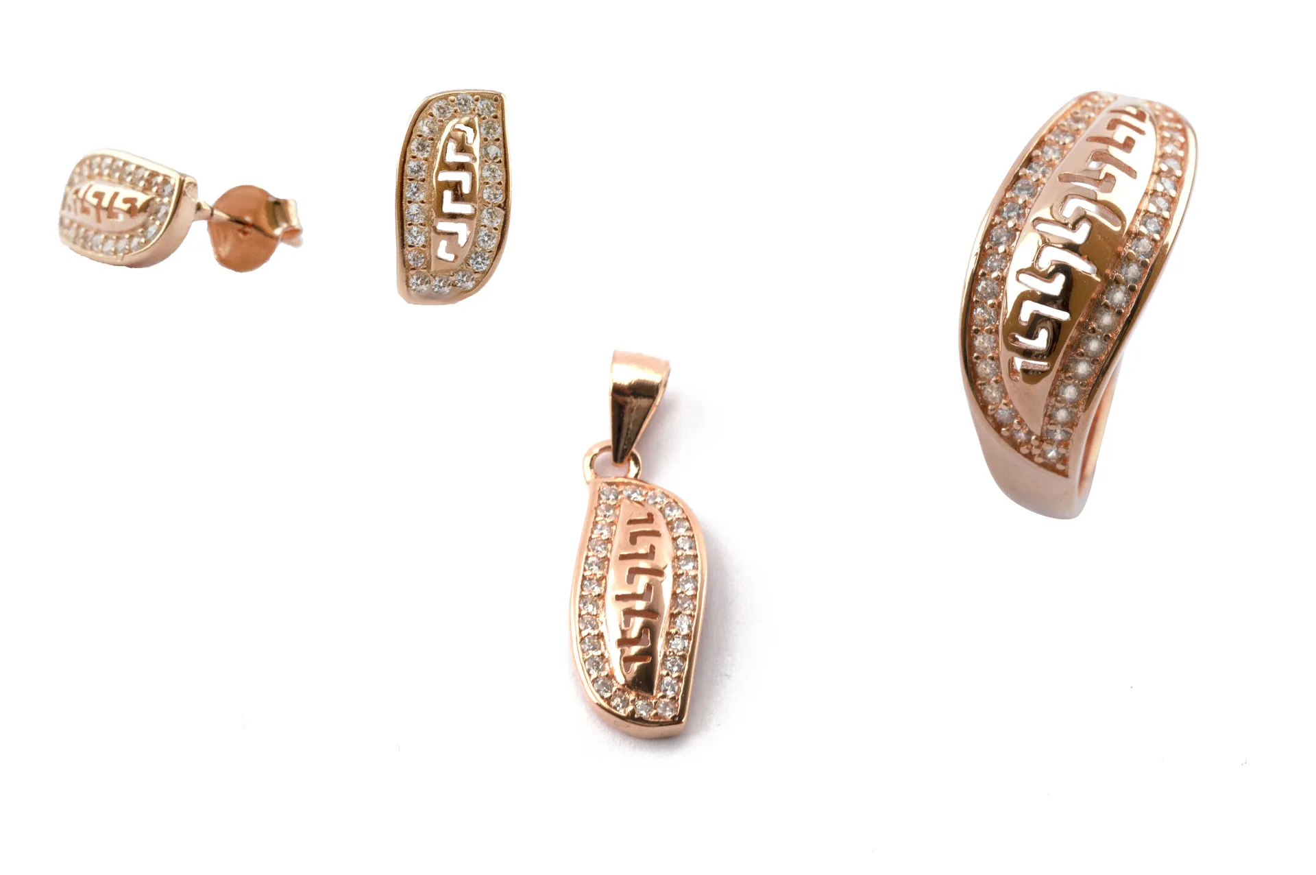 silverline, ασημένιο, γυναικείο, σετ (δαχτυλίδι-μενταγιόν χωρίς αλυσίδα-σκουλαρίκια) με ζιργκόν, γκρέκα και ροζ επιχρύσωμα