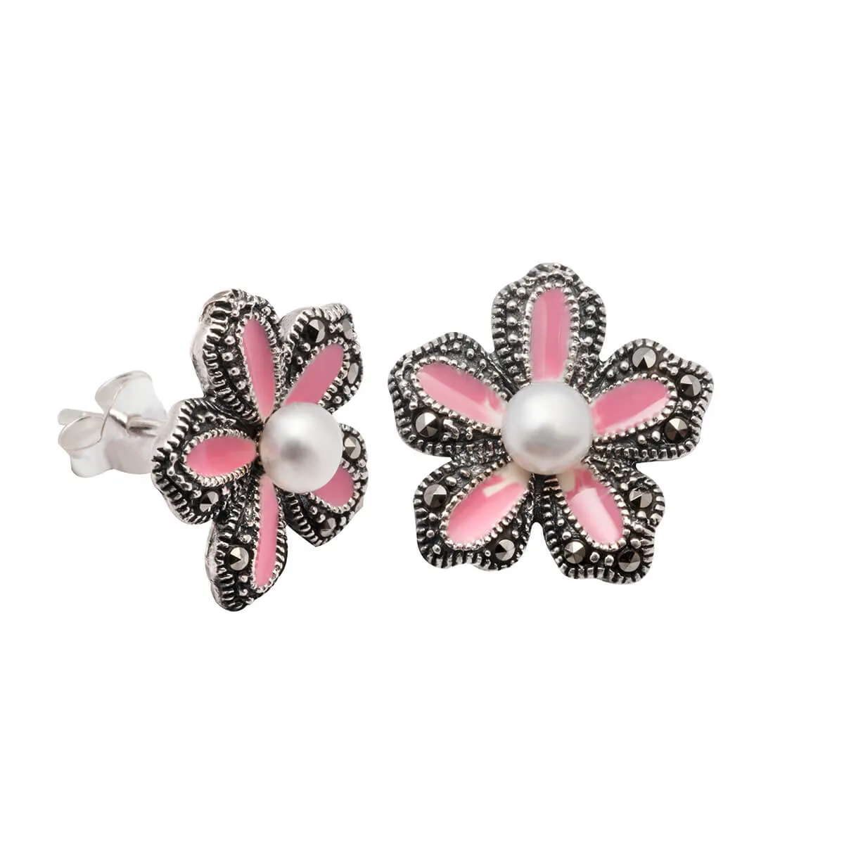 silverline, ασημένια, γυναικεία σκουλαρίκια με ροζ σμάλτο, μαργαριτάρια & μαρκασίτες