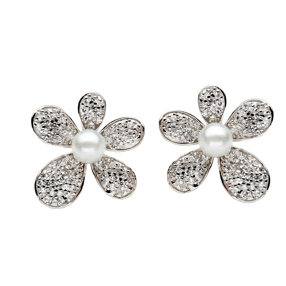 Γυναικεία σκουλαρίκια από ασήμι 925 επιπλατινωμένα με συνθετικό μαργαριτάρι και ζιργκόν. Χωρίς νικέλιο.