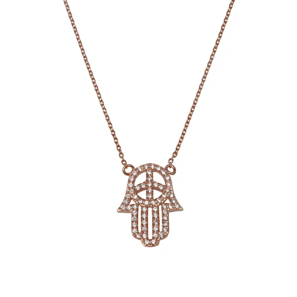 925 ασημένιο γυναικείο κολιέ, "χέρι της Φατιμά και σύμβολο ειρήνης", με ροζ χρυσό και ζιργκόν. Με ρυθμιζόμενη αλυσίδα επέκτασης.