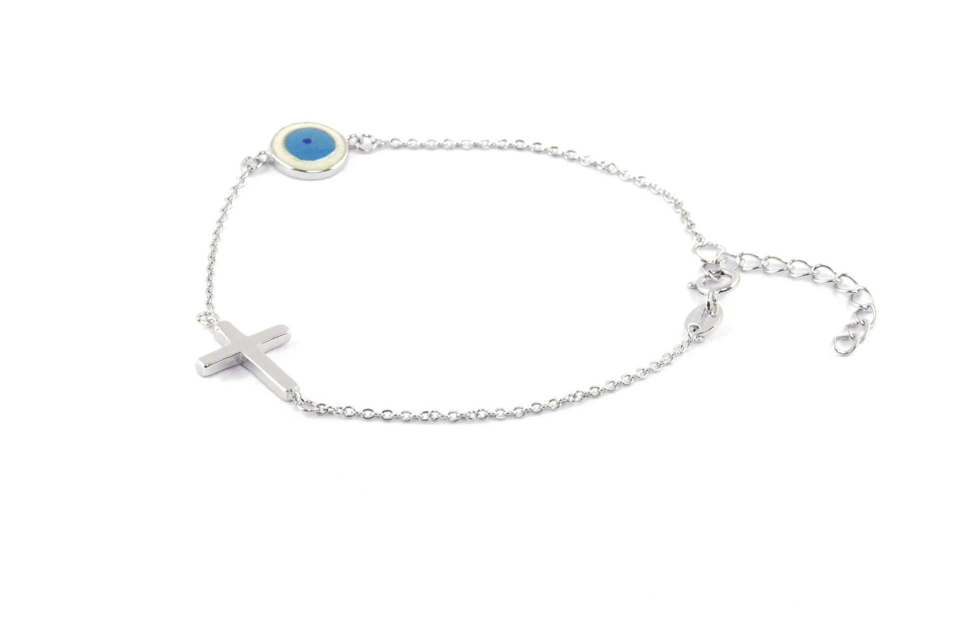 silverline, ασημένιο, γυναικείο βραχιόλι, με σταυρό & μάτι βασκανίας από σμάλτο, επιπλατινωμένο, χωρίς νικέλιο ,