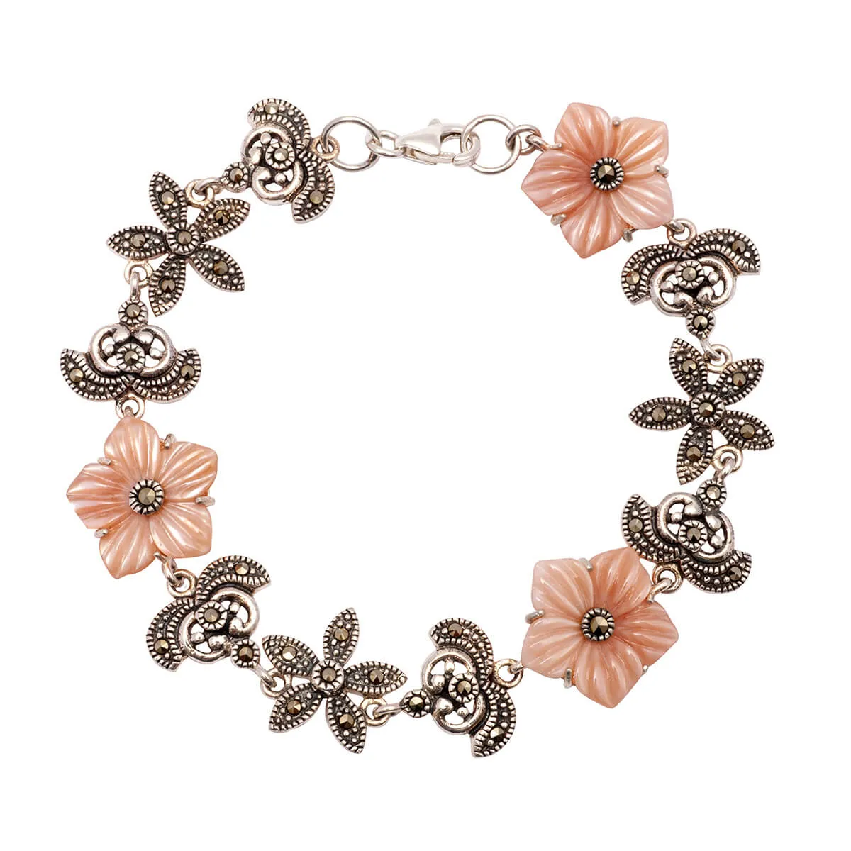 silverline, ασημένιο βραχιόλι γυναικείο με λουλούδια, ροζ φίλντισι & μαρκασίτες