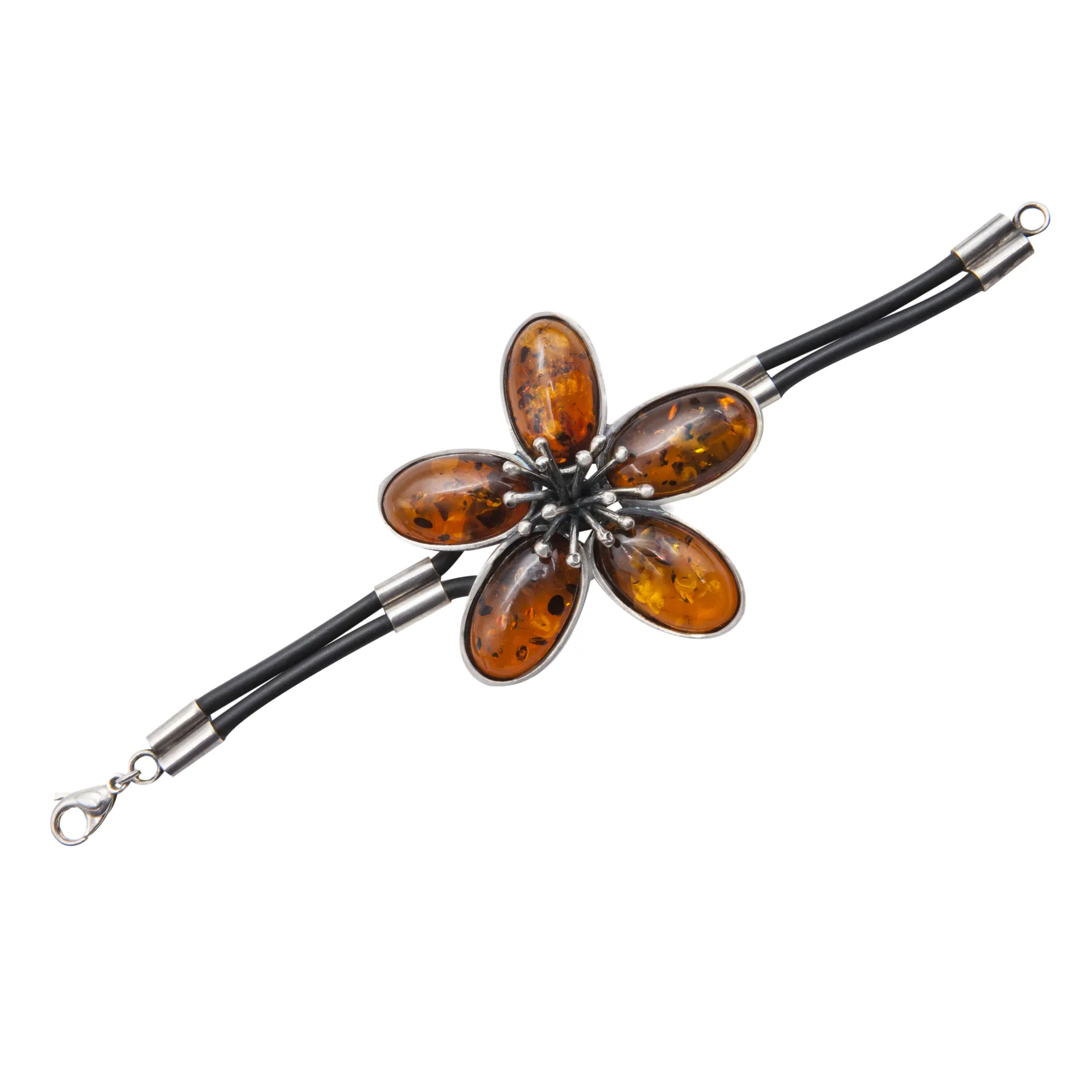 Εντυπωσιακό, χειροποίητο βραχιόλι για γυναίκες με γνήσιο κεχριμπάρι σε σχήμα λουλουδιού από 925 ασήμι, free size, μπορεί να τοποθετηθεί αλυσίδα επέκτασης στο επιθυμητό μήκος, με μαύρο καουτσούκ από τη silverline.
