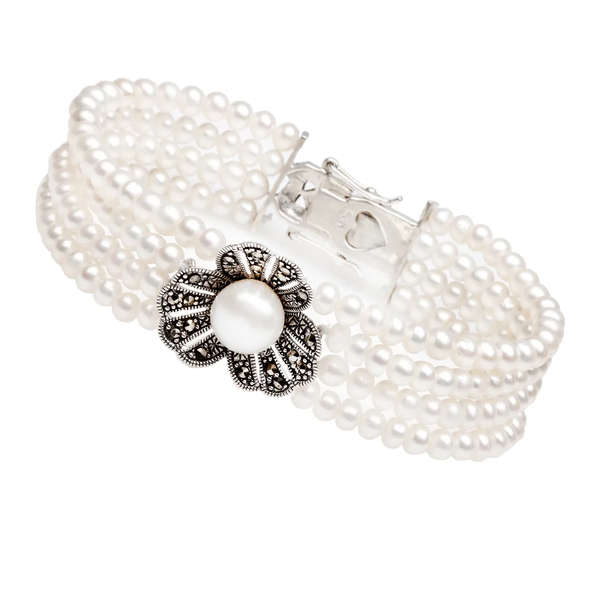 Βραχιόλι από ασήμι 925 με πέτρες μαρκασίτη, μαργαριτάρια και λουλούδι. Χωρίς νικέλιο, μεσαίου μεγέθους μήκους 18,5-19 εκ. και κούμπωμα.