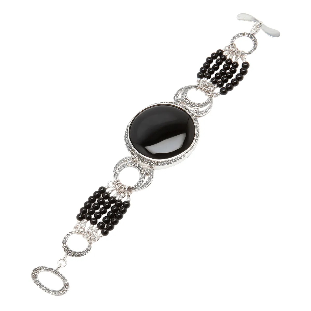 Βραχιόλι από ασήμι 925 με πέτρες μαρκασίτη και μαύρο όνυχα. Χωρίς νικέλιο, μεσαίου μεγέθους μήκους 18,5-19 εκ. και κούμπωμα.