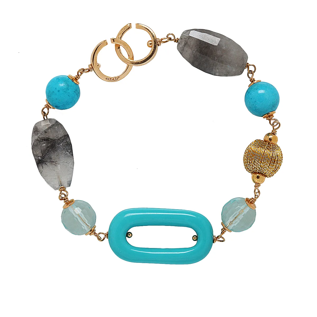 Λουστράτο βραχιόλι από ασήμι 925 με 2micro χρυσού, σατέν και άκουα μαρίνα, λαβραδορίτη και τυρκουάζ πέτρες. Χωρίς νικέλιο, μεσαίου μεγέθους μήκους 18,5-19 εκ. και κούμπωμα.