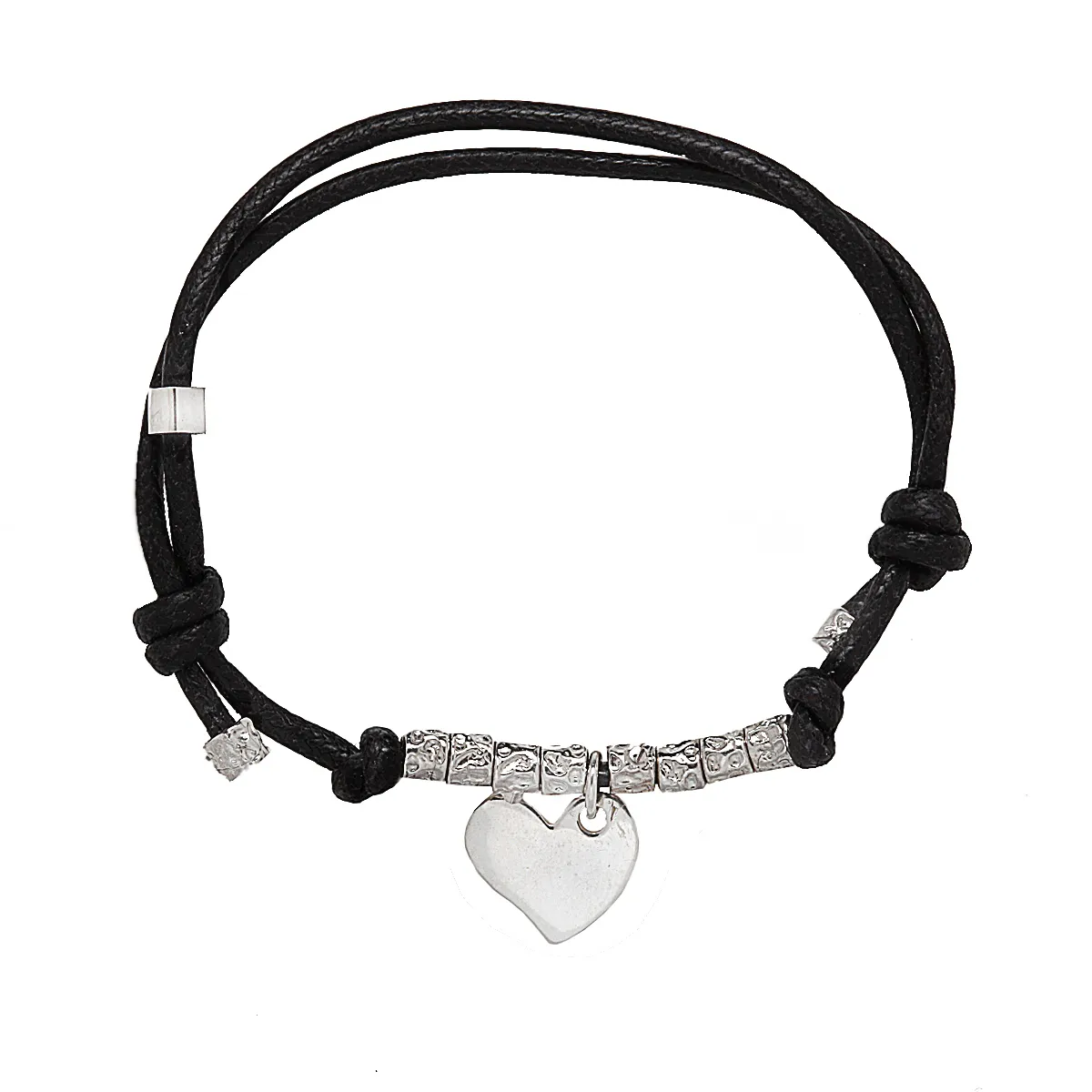 Λουστράτο βραχιόλι από ασήμι 925 με σφυρήλατες λεπτομέρειες, μαύρο βαμβακερό κορδόνι και καρδιά. Χωρίς νικέλιο, μεσαίου μεγέθους μήκους 18,5-19 εκ.