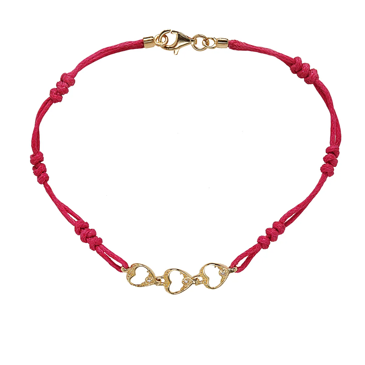 Λουστράτο βραχιόλι από ασήμι 925 με χρυσό επιπλατίνωμα, ζιργκόν και κόκκινο βαμβακερό κορδόνι. Χωρίς νικέλιο, μεσαίου μεγέθους μήκους 18,5-19 εκ. και κούμπωμα.