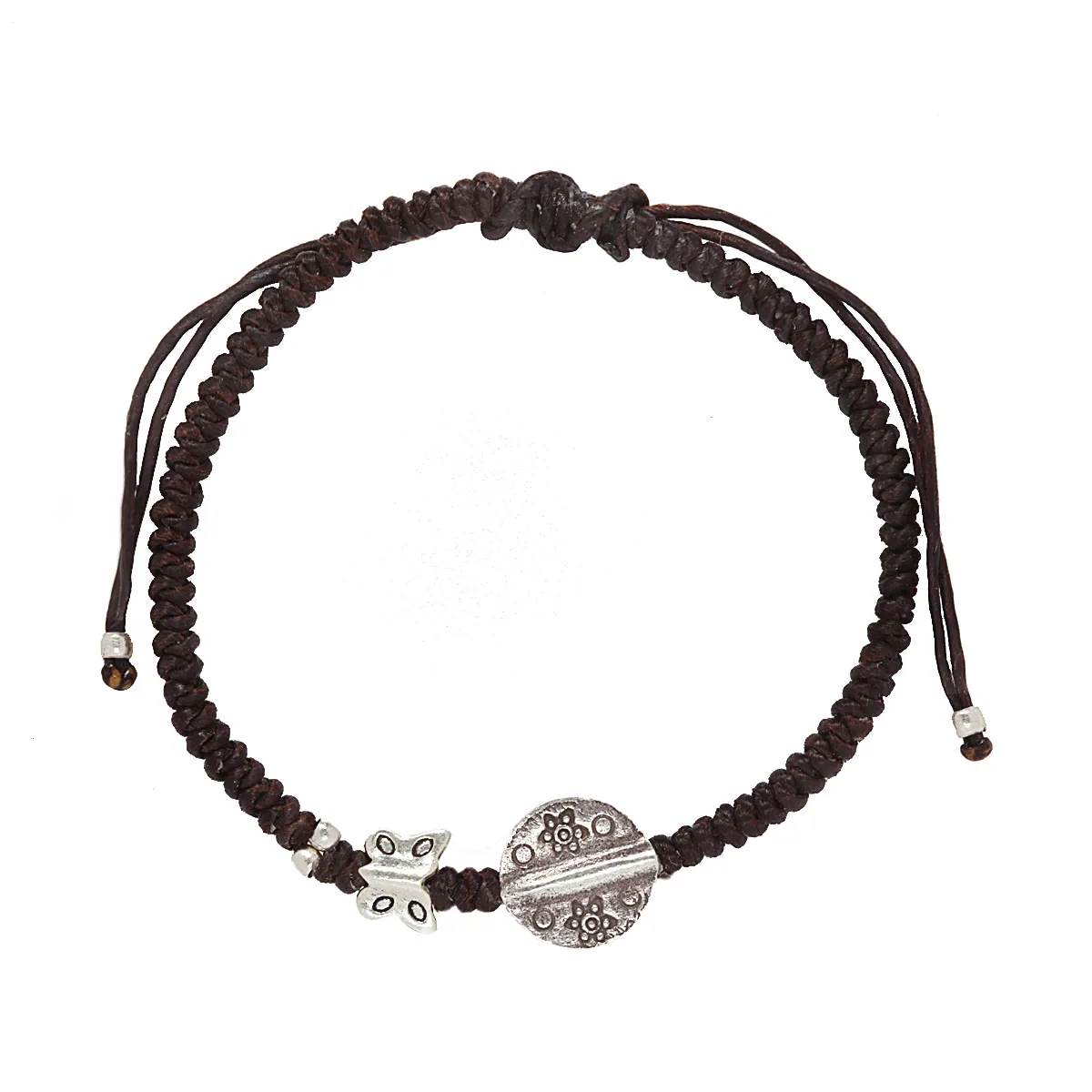 Λουστράτο βραχιόλι από οξειδωμένο ασήμι 925, με μαύρο βαμβακερό κορδόνι. Χωρίς νικέλιο, μεσαίου μεγέθους μήκους 18,5-19 εκ. και κούμπωμα.