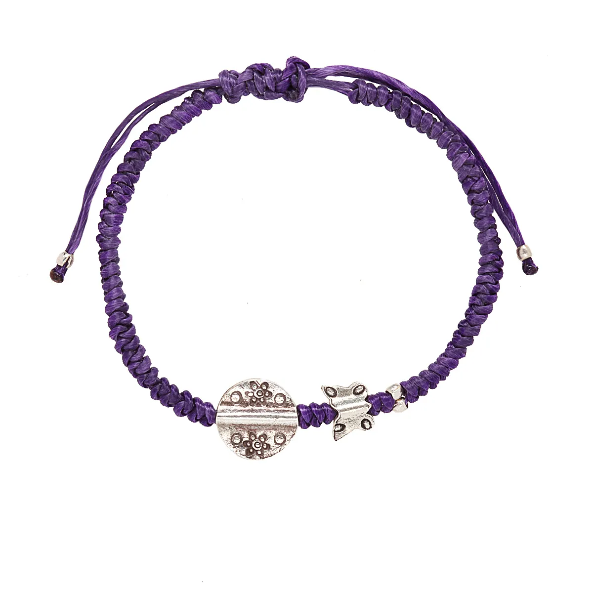 Λουστράτο βραχιόλι από οξειδωμένο ασήμι 925, με μοβ βαμβακερό κορδόνι. Χωρίς νικέλιο, μεσαίου μεγέθους μήκους 18,5-19 εκ. και κούμπωμα.