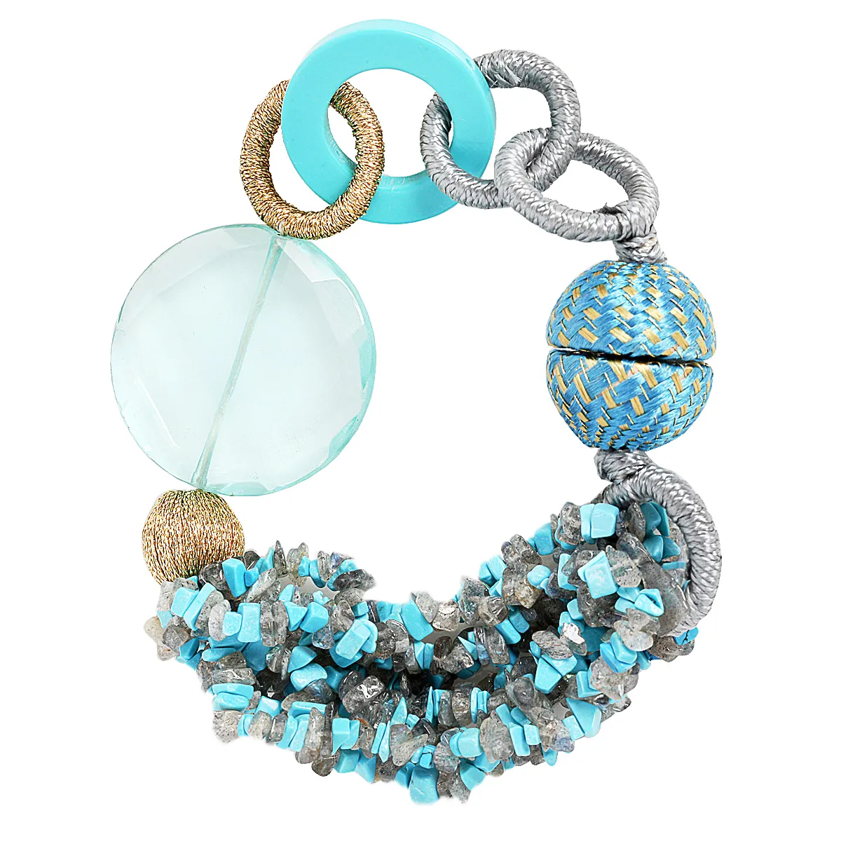 Bραχιόλι με σατέν και άκουα μαρίνα, λαβραδορίτη και τυρκουάζ. Χωρίς νικέλιο, μεσαίου μεγέθους μήκους 18,5-19 εκ. και μαγνητικό κούμπωμα.