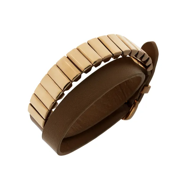 γυναικείο βραχιόλι από ανοξείδωτο ατσάλι με ροζ χρυσό & καφέ δέρμα