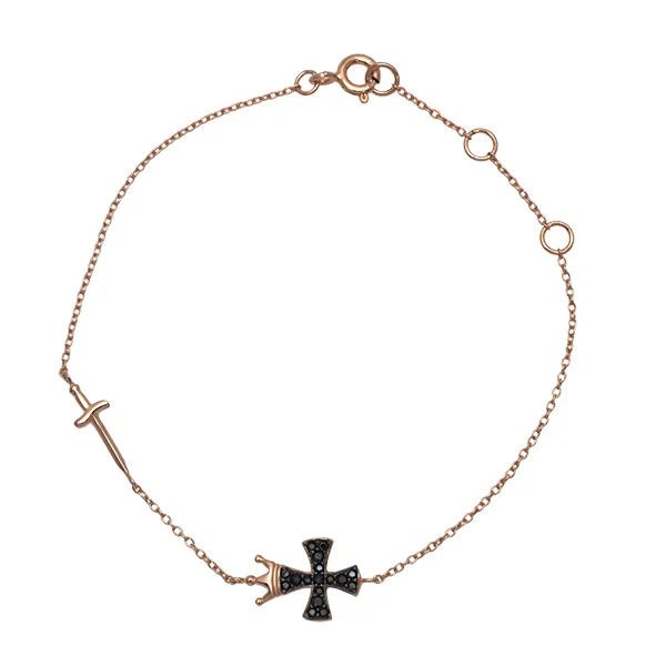 925 ασημένιο γυναικείο βραχιόλι, σταυρο, με ροζ χρυσό και μαυρα ζιργκόν.