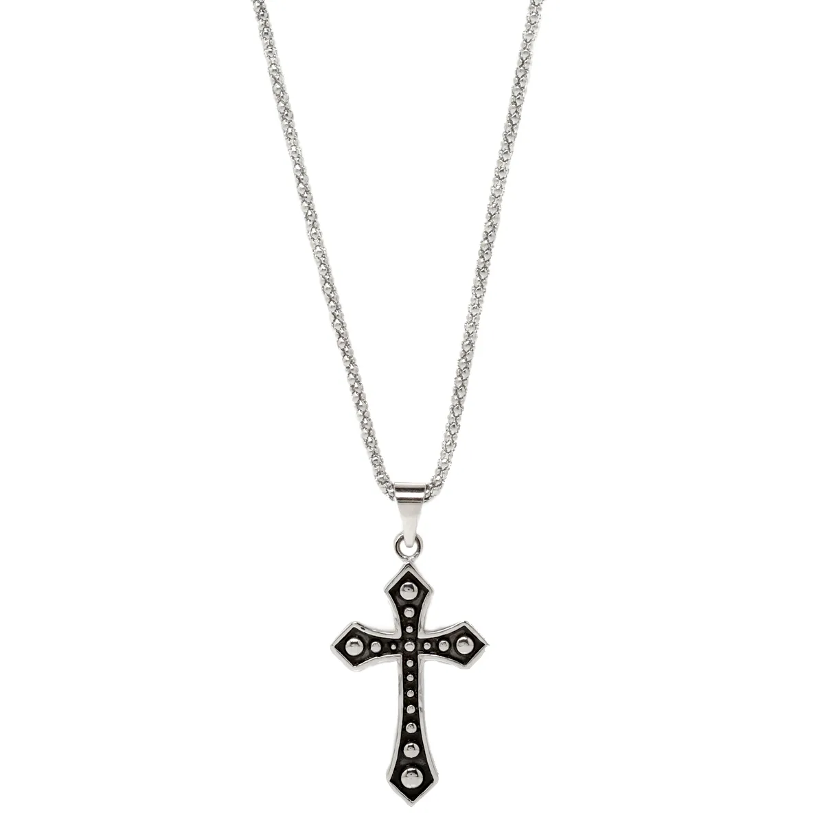 Λουστράτο κολιέ από ανοξείδωτο ατσάλι με σταυρό και δυο επιπλατινώματα: λευκό και μαύρο. Με αλυσίδα.