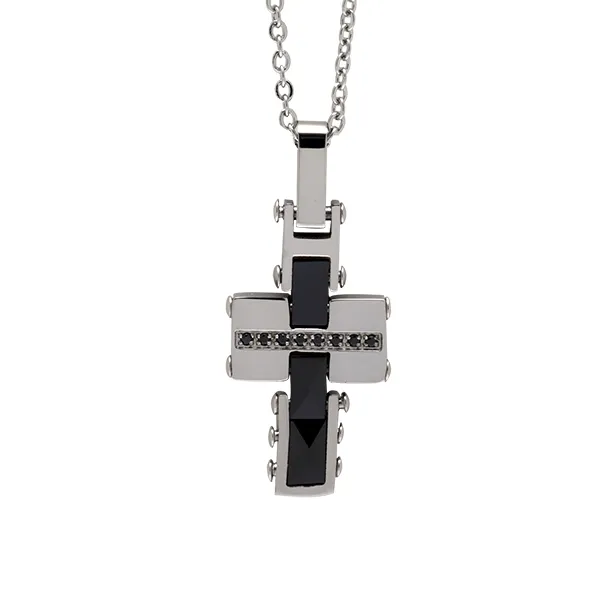 Kολιέ από ανοξείδωτο ατσάλι με σταυρό, μαυρα ζιργκόν και 2 επιπλατινώματα: λευκό και μαύρο. Με αλυσίδα.