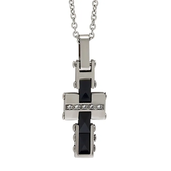 Kολιέ από ανοξείδωτο ατσάλι με σταυρό, ζιργκόν και 2 επιπλατινώματα: λευκό και μαύρο. Με αλυσίδα.