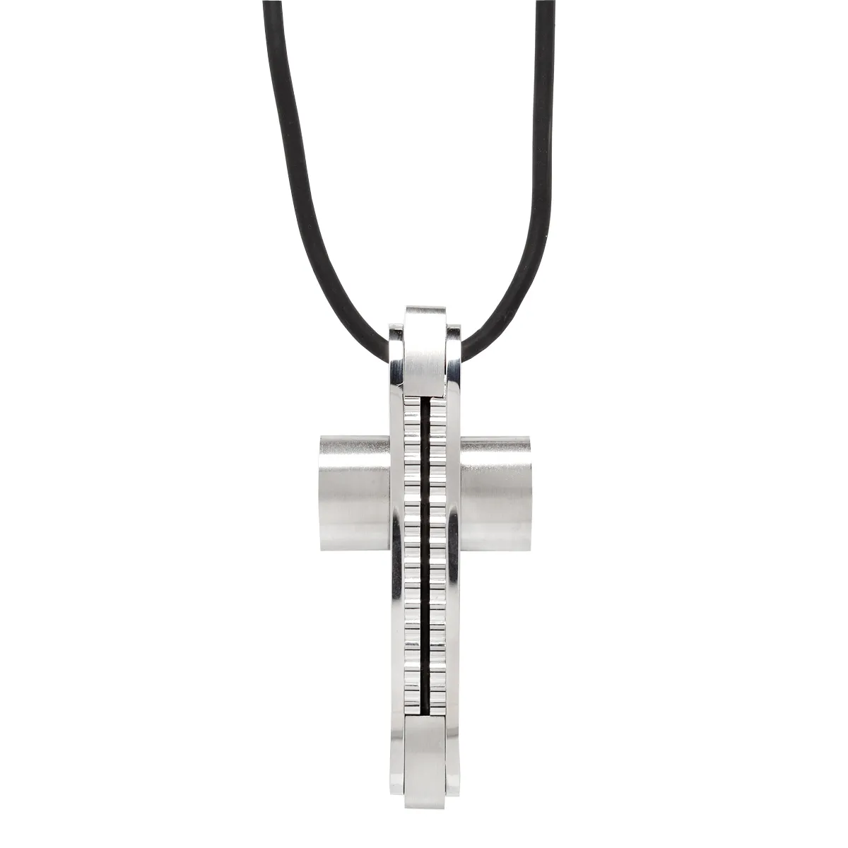 Ματ & Λουστράτο κολιέ από ανοξείδωτο ατσάλι με σταυρό και λεπτομέρεια από μαύρο καουτσούκ. Με κορδόνι από μαύρο καουτσούκ.