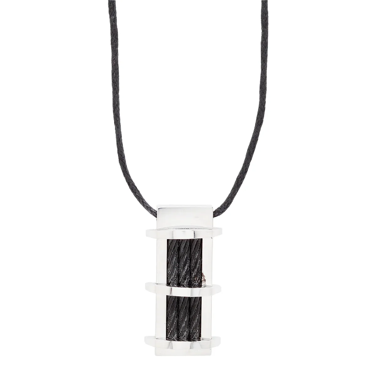 Λουστράτο ανδρικό κολιέ από ανοξείδωτο ατσάλι και λεπτομέρειες από βαμβάκι. Με βαμβακερό μαύρο κορδόνι.