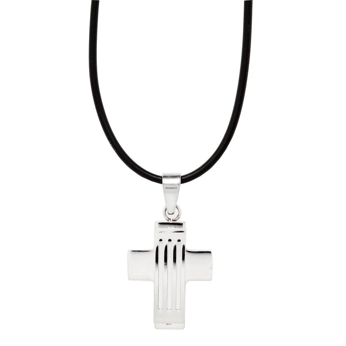 Λουστράτο ανδρικό κολιέ από ανοξείδωτο ατσάλι με σταυρό. Με κορδόνι από μαύρο καουτσούκ.