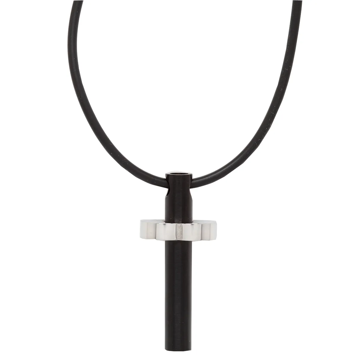 Λουστράτο κολιέ με μενταγιόν σταυρό και δυο επιπλατινώματα: λευκό και μαύρο. Με κορδόνι από μαύρο καουτσούκ.