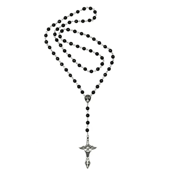 ΑΝΔΡΙΚΟ ΚΟΛΙΕ ΑΠΟ ΑΝΟΙΞΕΙΔΩΤΟ ΑΤΣΑΛΙ, ΡΟΖΑΡΙΟ ΜΕ ΜΑΥΡΟ ΟΝΥΧΑ & ΣΤΑΥΡΟ ΣΕ ΣΧΗΜΑ ΣΠΑΘΙΟΥ