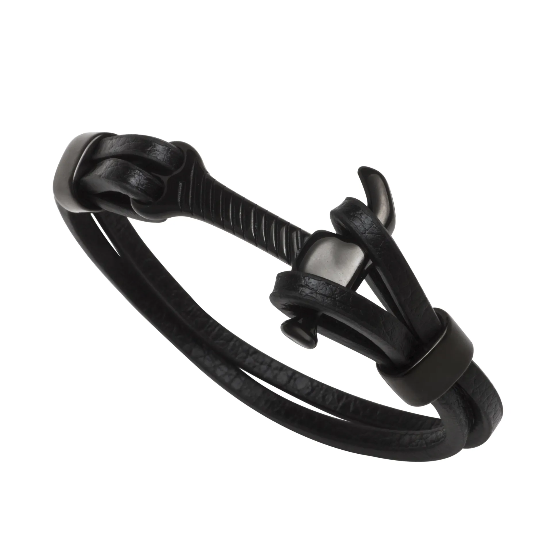 TRIBUTE, Ανδρικό Βραχιόλι από ανοξείδωτο ατσάλι με μαύρο ρόδιο, μαύρο δέρμα & σφυρί τσαγκάρη, 21 εκατοστ΄΄α με το κούμπωμα