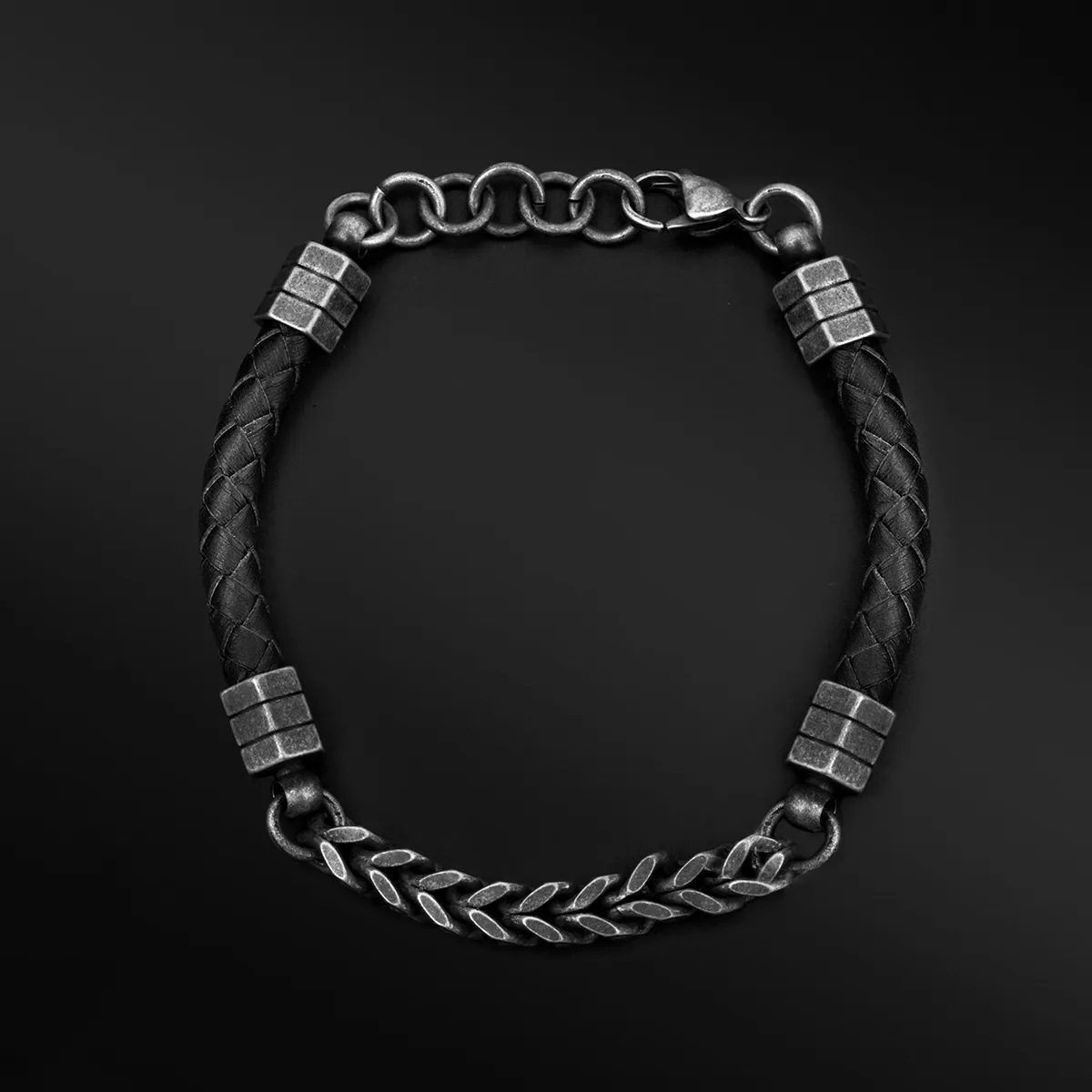 Βραχιόλι, ανδρικό, από ανοξείδωτο ατσάλι, με δέρμα, οξειδωμένο, 20 εκατοστά συν 2,5 εκατοστά αλυσίδα επέκτασης, TRIBUTE