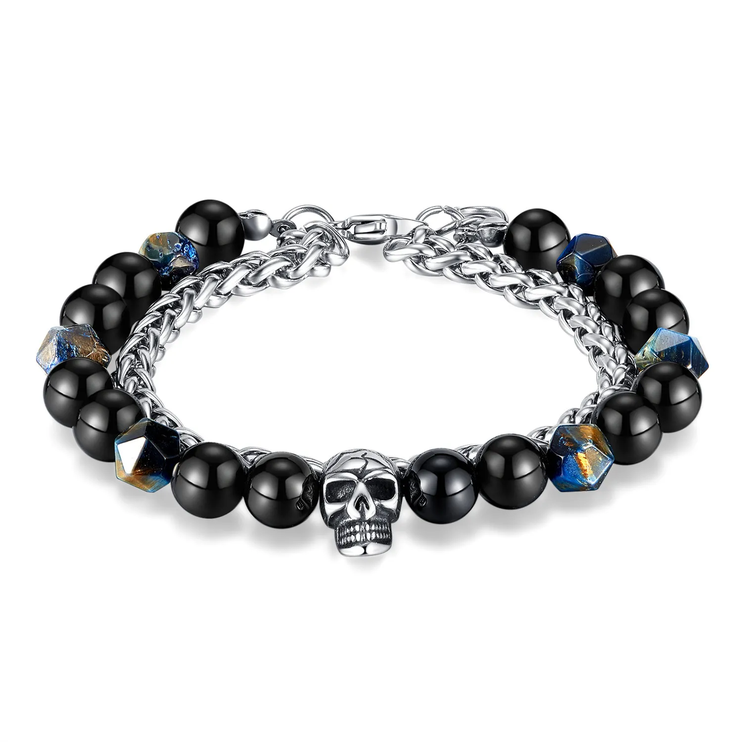 TRIBUTE, ανδρικό βραχιόλι από ανοξείδωτο ατσάλι με μαύρους αχάτες, αβεντουρίνη & νεκροκεφαλή, 19+3,5 εκατοστά αλυσ.επέκτασης, 0230451601