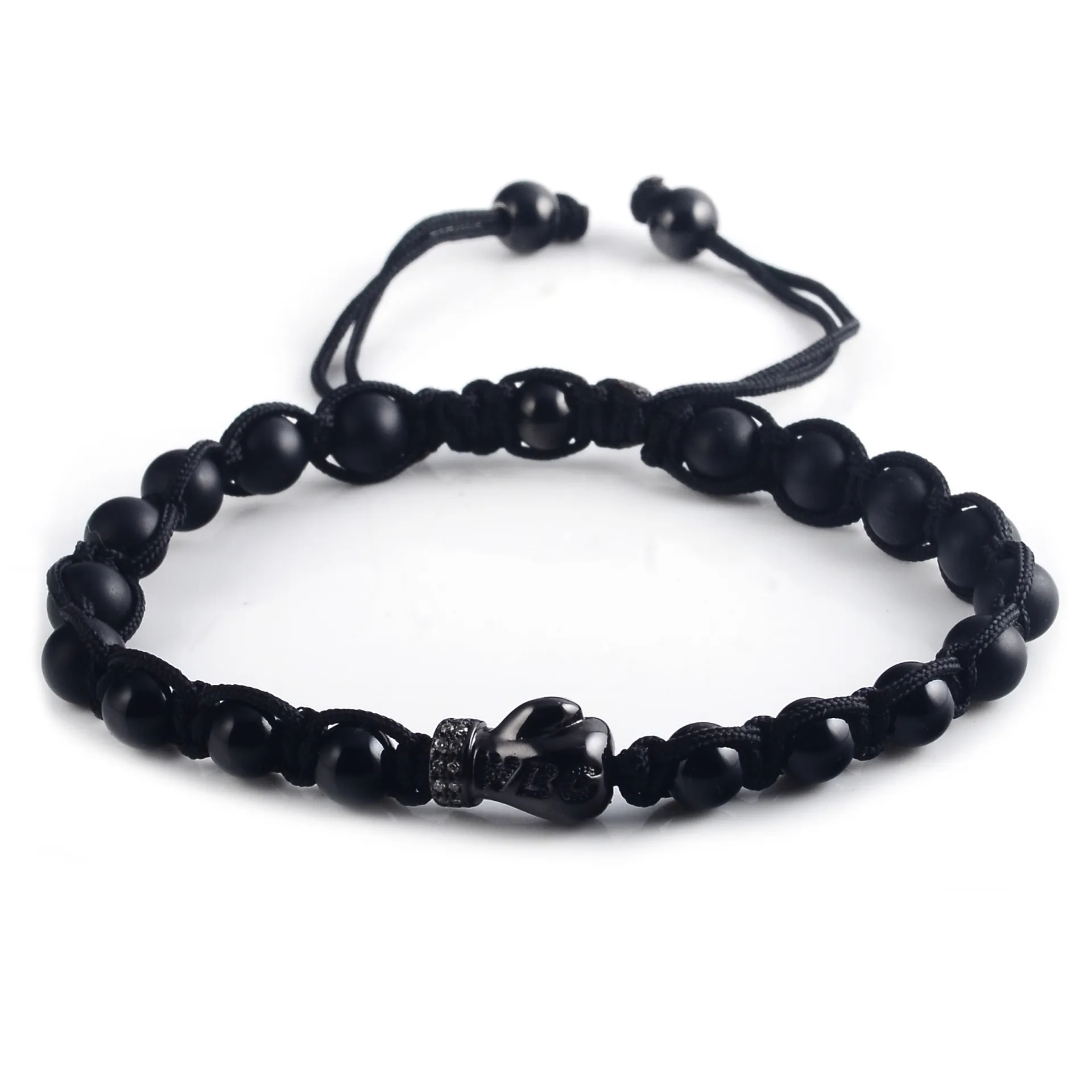 Μακραμέ, free size βραχιόλι για άνδρες από ανοξείδωτο ατσάλι με μαύρους όνυχες, λευκά ζιργκόν, γάντι πυγμαχίας και μαύρο ρόδιο.