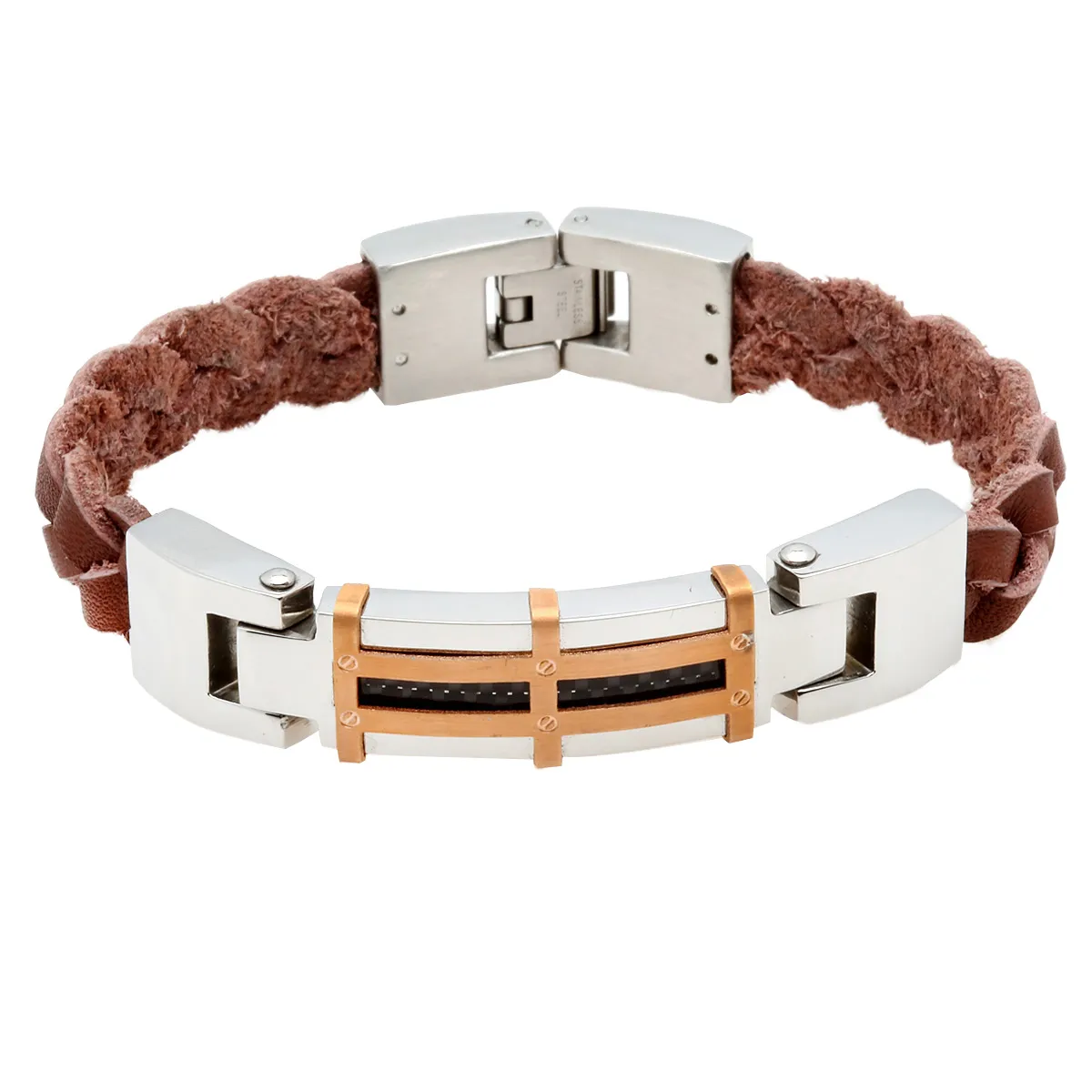 Ανδρική χειροπέδα από ανοξείδωτο ατσάλι, λεπτομέρεια από καφέ δέρμα και 2 επιπλατινώματα: λευκό και ροζ χρυσό.
