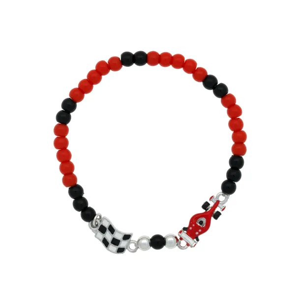 Woofie, ασημένιο ,παιδικό ,βραχιόλι για αγόρια, με σμάλτο, άσπρο ρόδιο, κόκκινες & μαύρες χάντρες, φόρμουλα & σημαία εκκίνησης