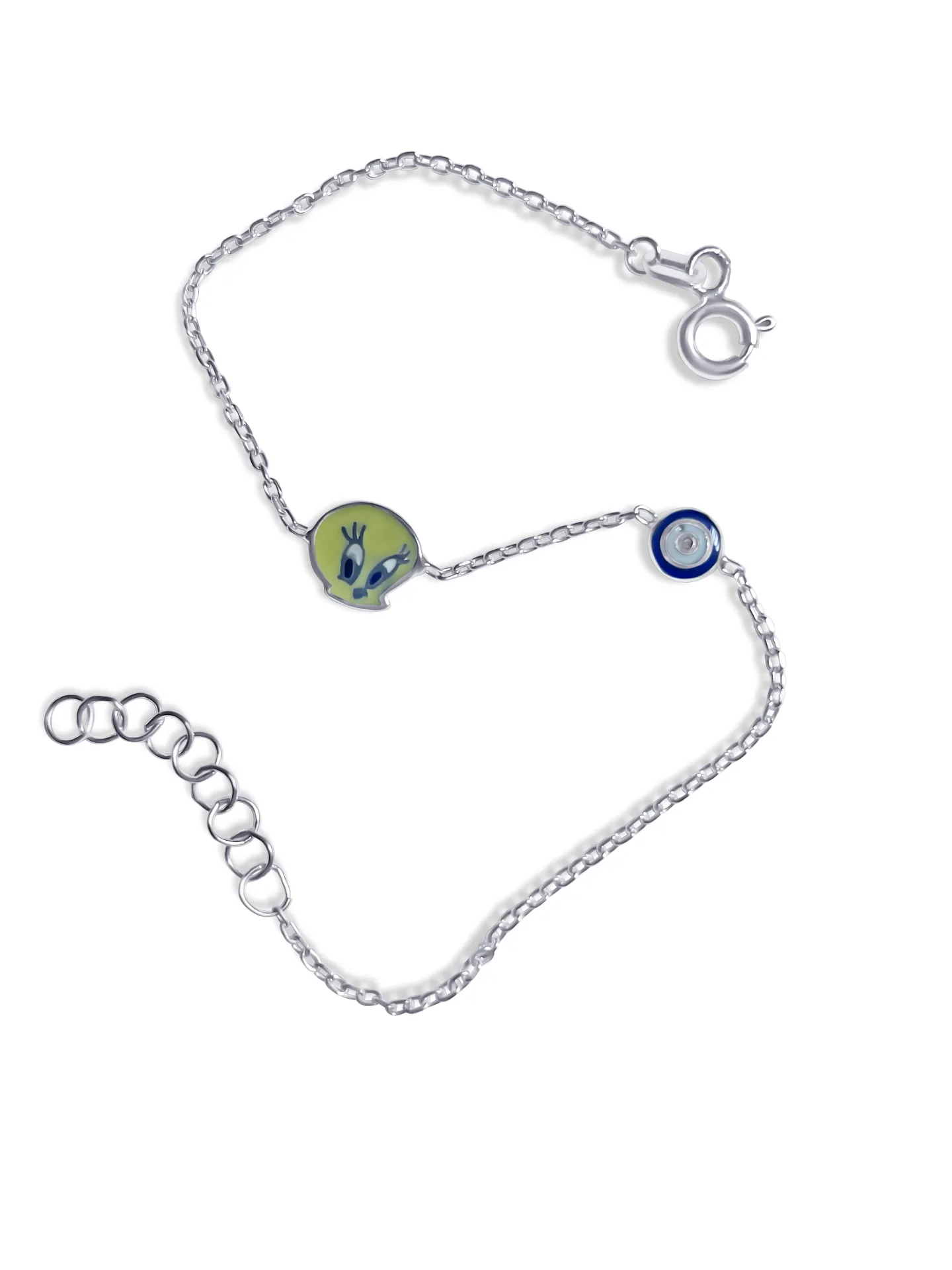Ασημένιο, παιδικό βραχιόλι για κορίτσια & αγόρια, με σμάλτο, μάτι βασκανίας & καναρίνι & 14,5 εκατοστά μήκος με αλυσίδα επέκτασης 2,4 εκατοστών, woofie, WBRA13 ,