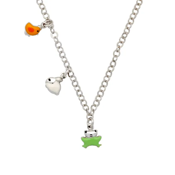 Woofie, Ασημένιο Παιδικό Κολιέ για κορίτσια με άσπρο επιπλατίνωμα, σμάλτο, βατραχάκι, λαγουδάκι & κοτοπουλάκι