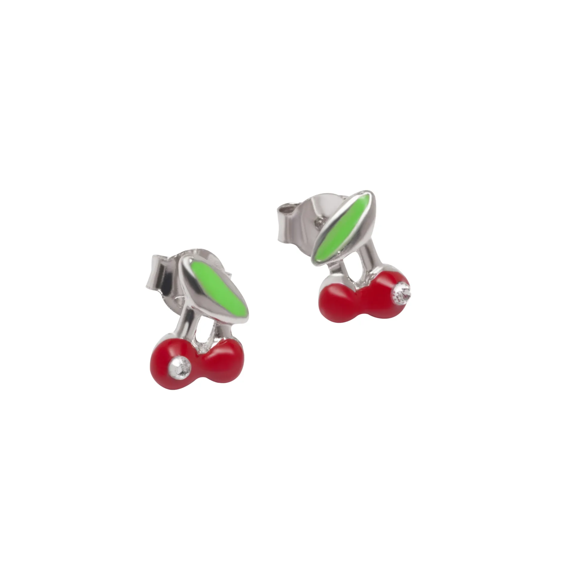 woofie, ασημένια, παιδικά σκουλαρίκια για κορίτσια με σμάλτο, κρυσταλλάκι, κερασάκια και άσπρο επιπλατίνωμα
