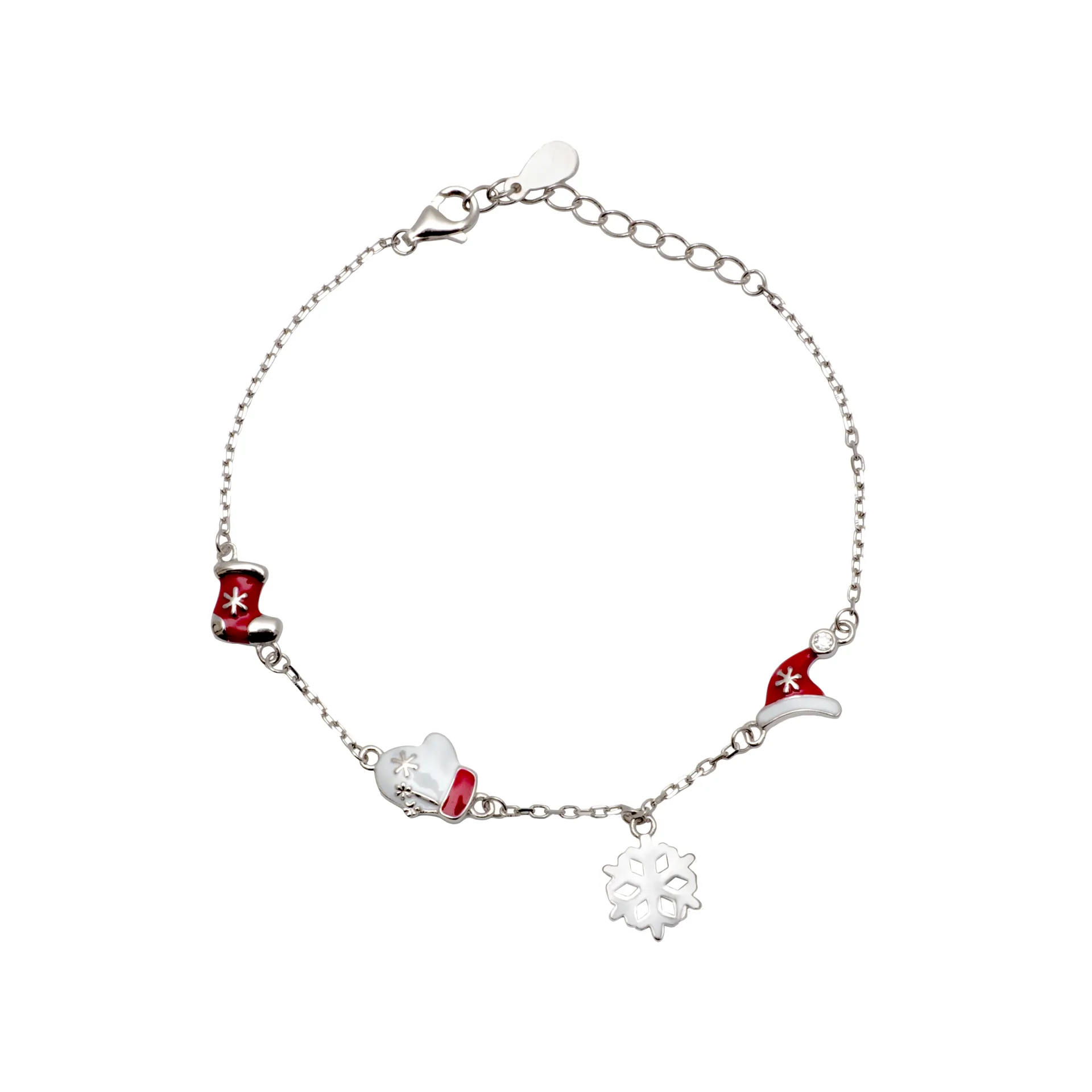 Woofie, ασημένιο, Χριστουγεννιάτικο, παιδικό, βραχιόλι με σμάλτο, χιονονιφάδα, μπότα, σκούφο, γάντια, ζιργκόν, άσπρο, επιπλατίνωμα,