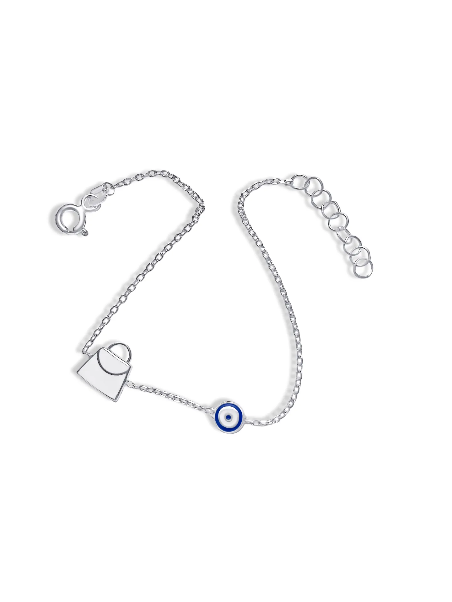Ασημένιο, παιδικό βραχιόλι για κορίτσια, με σμάλτο, μάτι βασκανίας & λευκό τσαντάκι, 14,5 εκατοστά μήκος με αλυσίδα επέκτασης 2,4 εκατοστών, woofie, WBRA14 ,