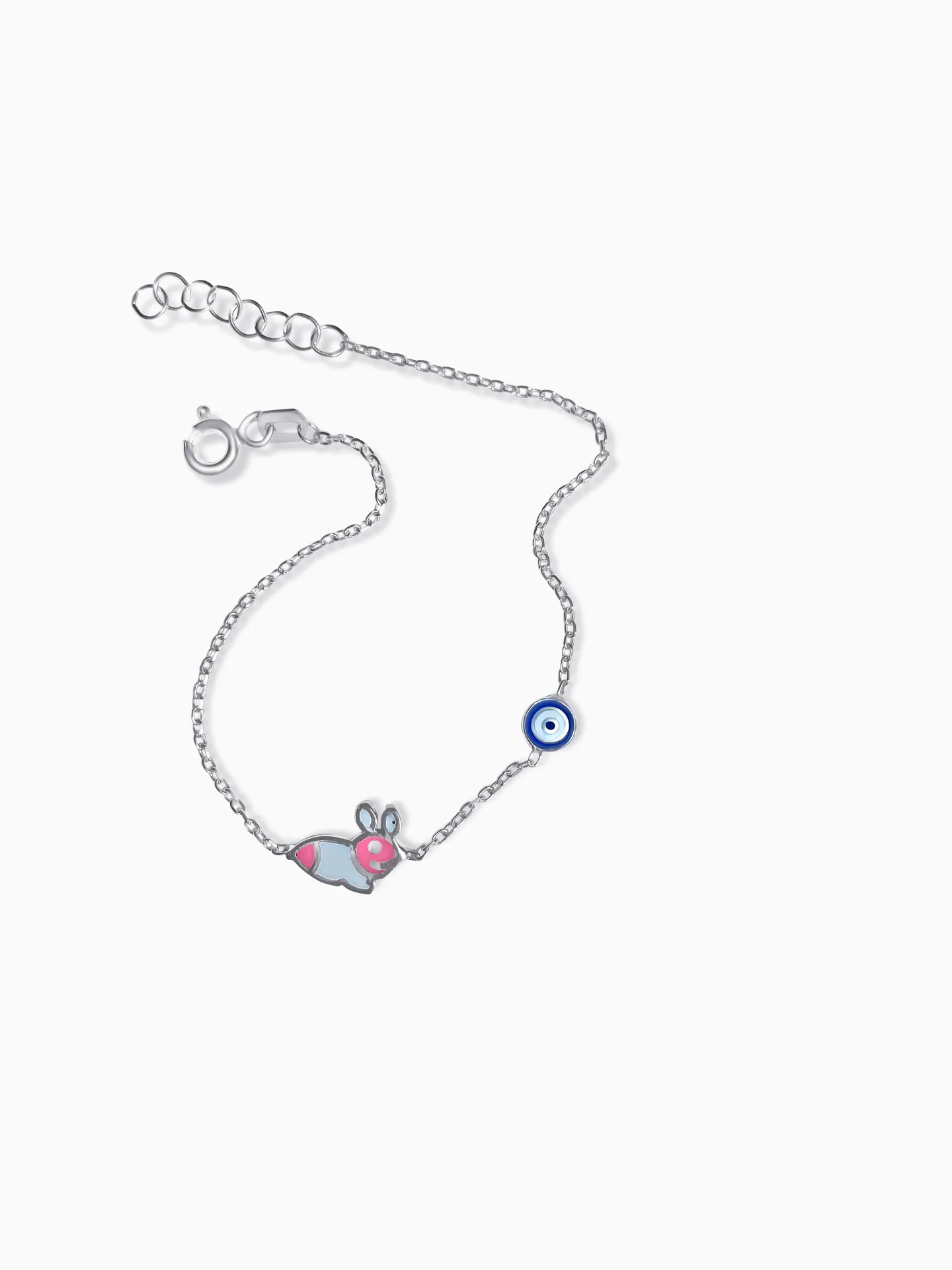 Ασημένιο, παιδικό βραχιόλι για κορίτσια, με σμάλτο, ροζ με λευκό λαγουδάκι, μάτι βασκανίας,14,5 εκατοστά μήκος με αλυσίδα επέκτασης 2,4 εκατοστών, woofie, WBRA 12,