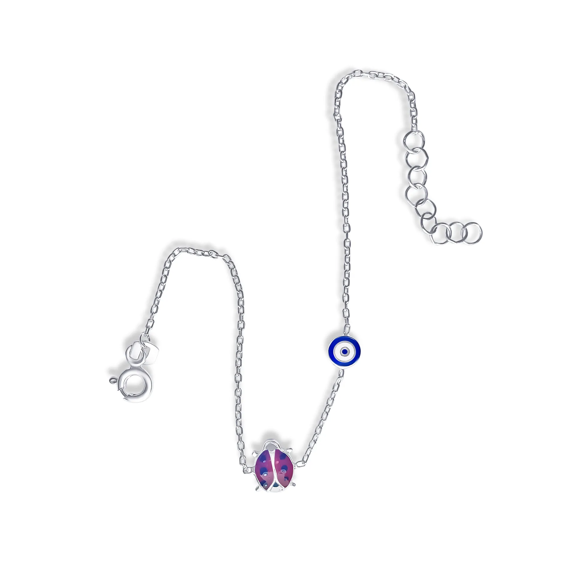 Ασημένιο, παιδικό βραχιόλι για κορίτσια, με σμάλτο, μάτι βασκανίας & πασχαλίτσα, 14,5 εκατοστά μήκος με αλυσίδα επέκτασης 2,4 εκατοστών, woofie, WBRA ,8